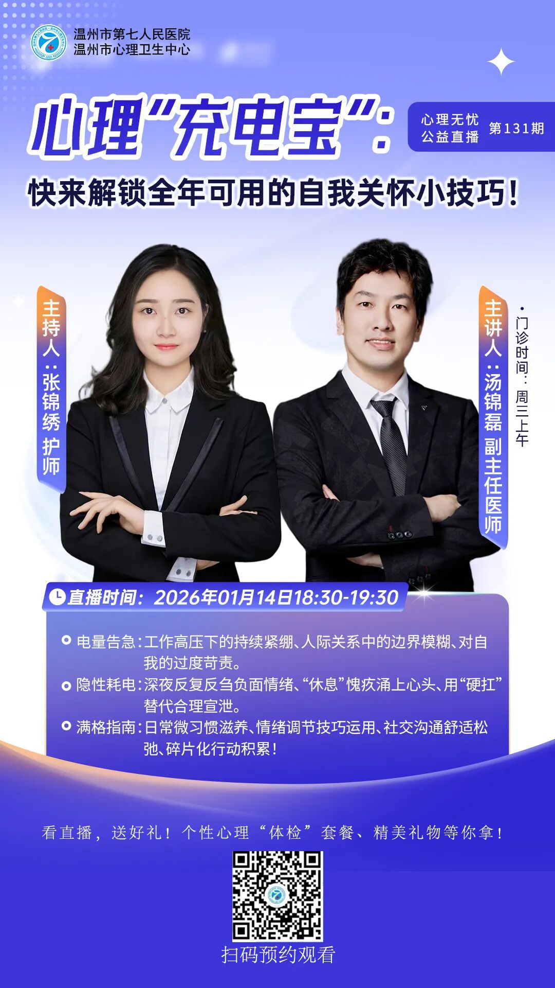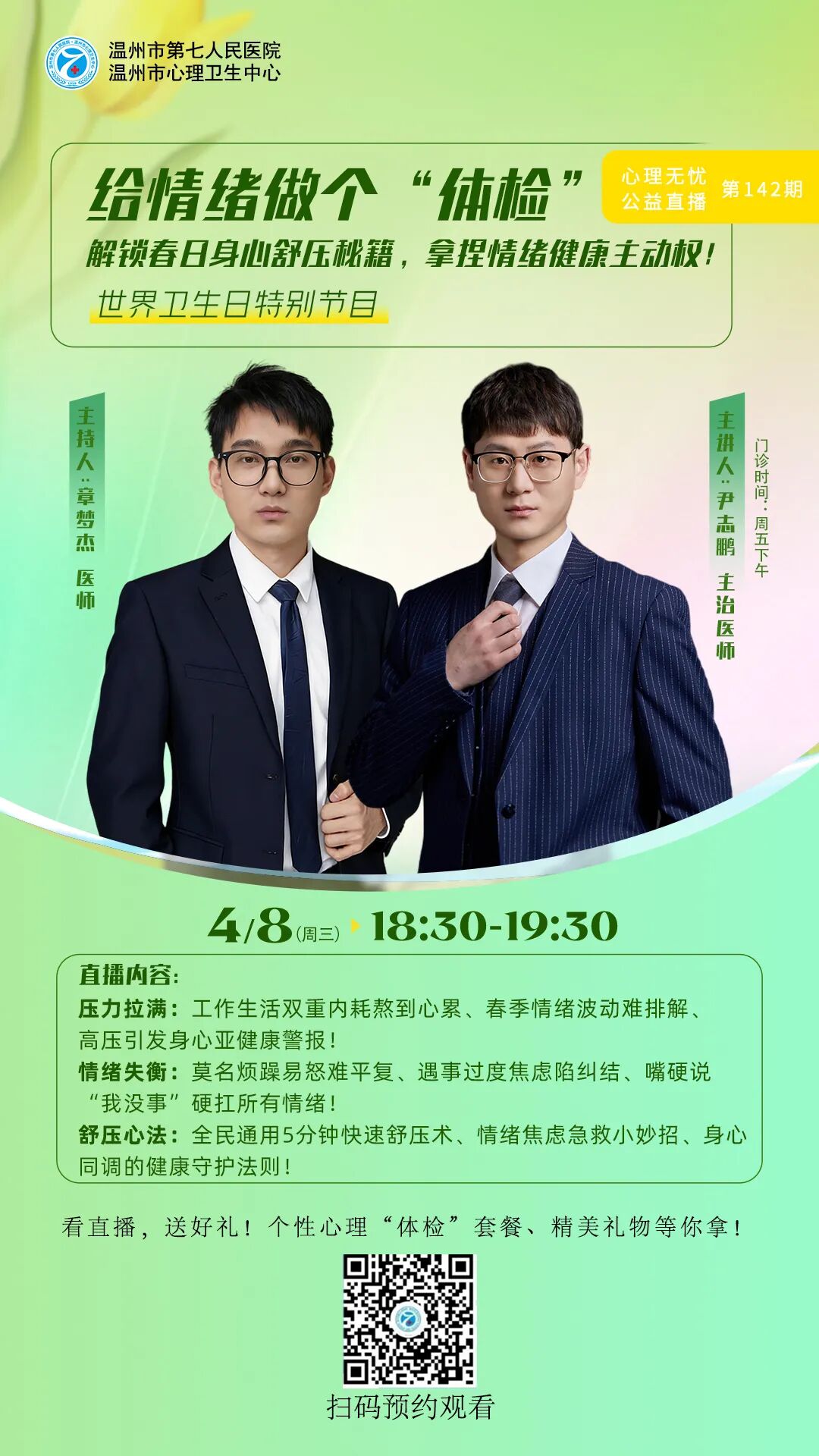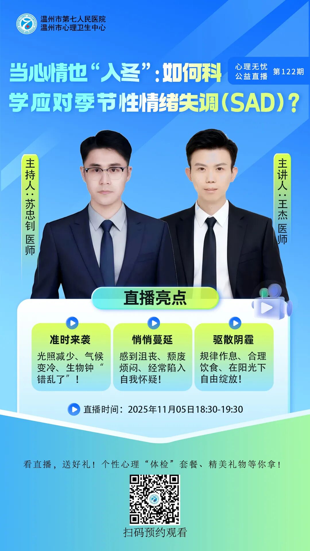 情感障碍科于2015年成立并成为医院院级重点学科,科室发展较快,为了满足患者需要,2020年元月分为501病区和502病区。是温州医科大学、济宁医学院等协作院校医学生的临床实习教学的主要科室,是我院国家医师规范化培训的主要科室 ,是集医疗、科研、教学于一体的综合科室。