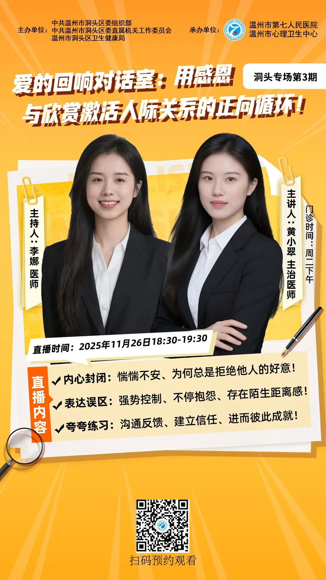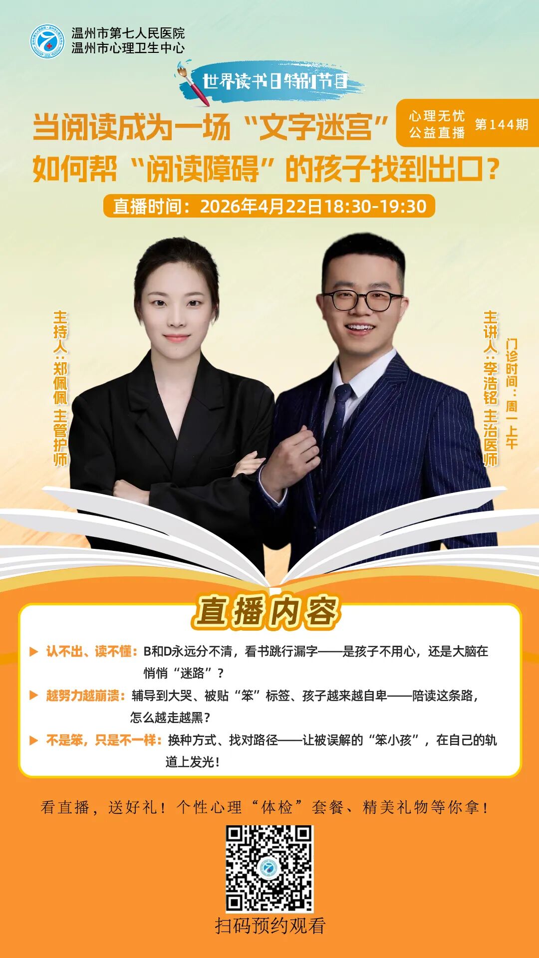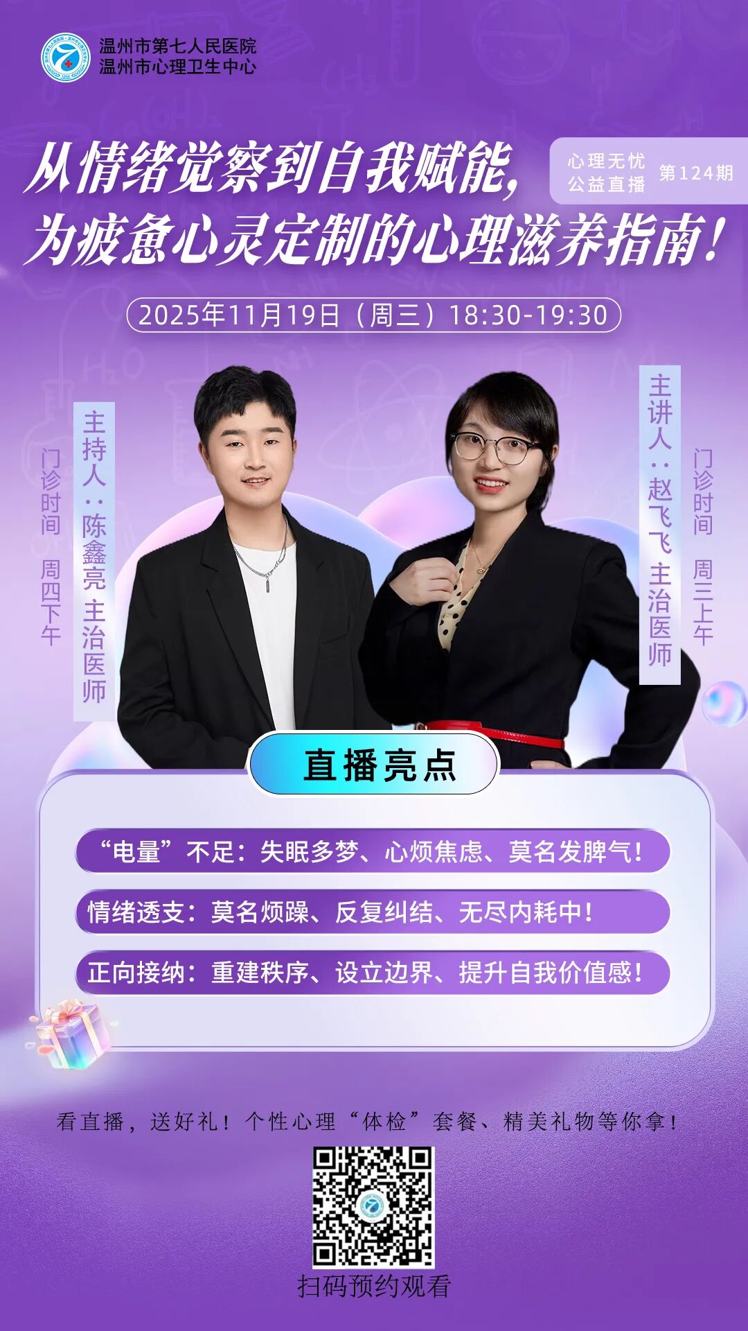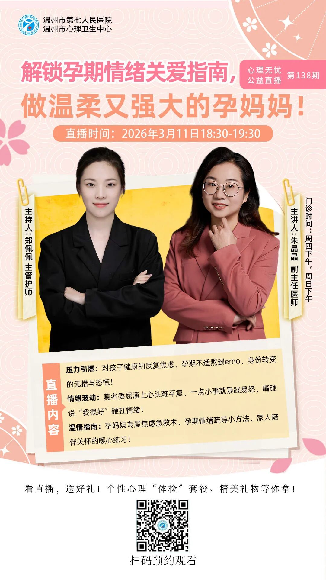 本院儿童精神科是温州市青少年诊治中心之一。科室创建于2018年,系院级医学重点学科(儿少心理科),2016年荣获“市青年文明号”称号,2017年获得“温州市巾帼文明岗”称号。2019年获“温州市青少年诊疗中心”,是温州医科大学医师培训实习基地。温州大学心理系教学科室。2023年2月正式命名为儿童精神科。