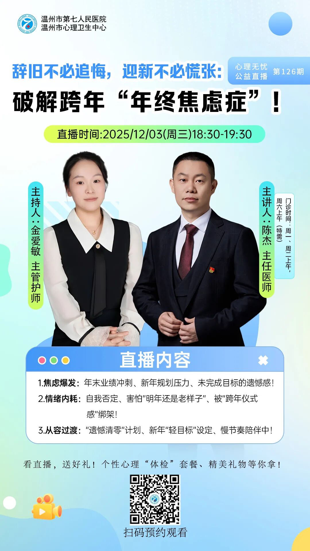 老年精神科(801病区)成立于2006年,是温州市老年重点学科群之一。科室整合“药物-心理-康复-护理”为一体,在药物治疗的基础上,配合神经肌肉电刺激治疗、认知行为治疗、日常生活能力训练、作业治疗、运动治疗、心理治疗等多种治疗手段,使老年人患者得到“身-心-灵”全面照护。