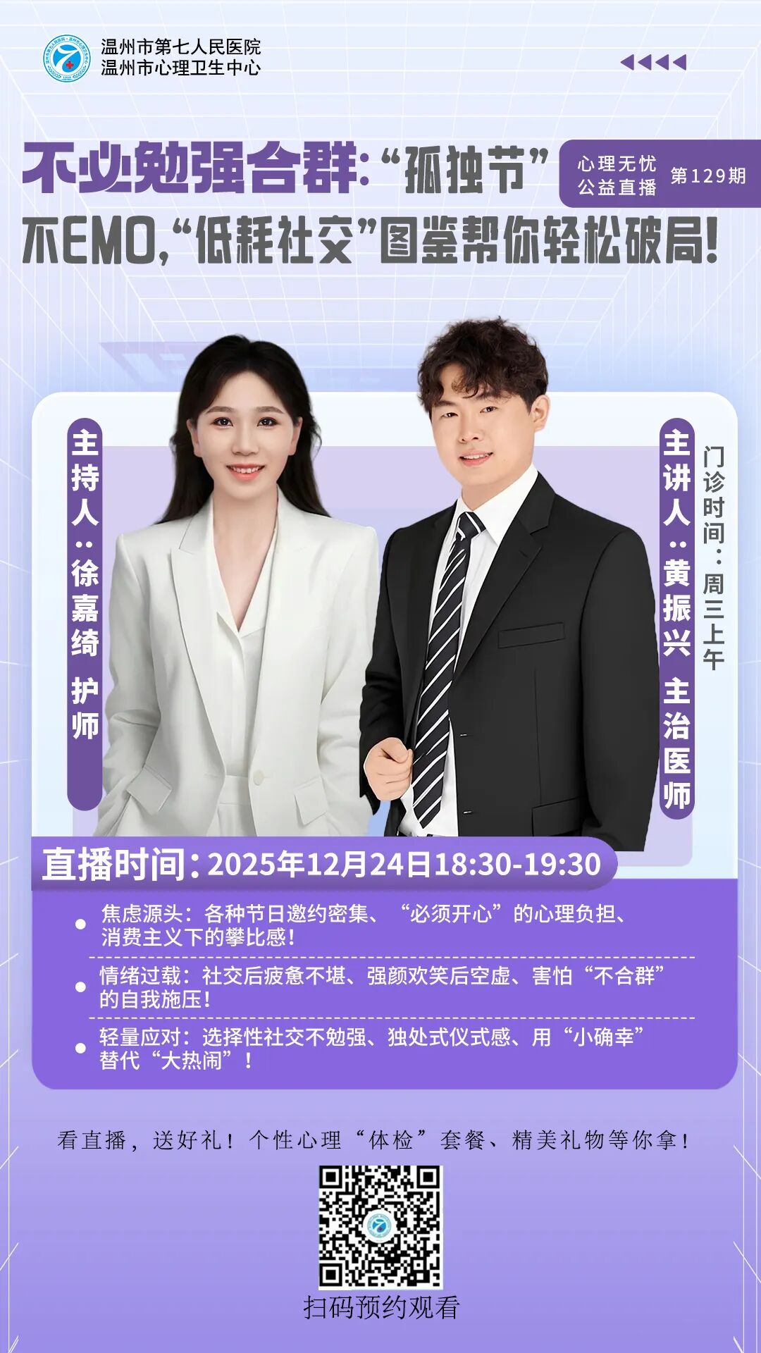 老年精神科(801病区)成立于2006年,是温州市老年重点学科群之一。科室整合“药物-心理-康复-护理”为一体,在药物治疗的基础上,配合神经肌肉电刺激治疗、认知行为治疗、日常生活能力训练、作业治疗、运动治疗、心理治疗等多种治疗手段,使老年人患者得到“身-心-灵”全面照护。